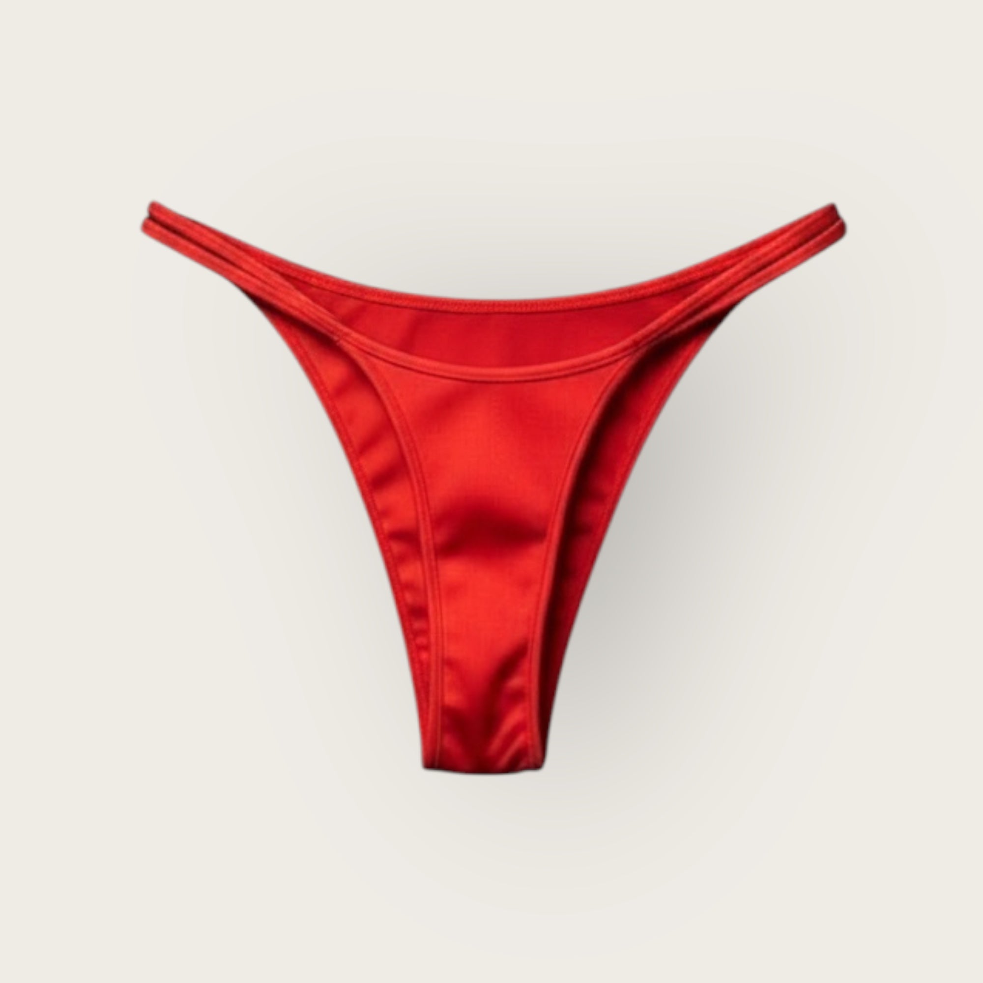 Features: cheeky coverage, double strap side detail, high hip, contrast piping